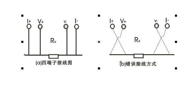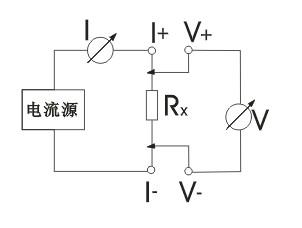 由电流源经“I+、I-两端口(也称I型口),供给被测电阻Rx电流,电流的大小有电流表I读出,Rx两端的电压降“V+、V-”两端口(也称V型口)取出,由电压表V读出。通过对I、V的测量,就可以算出被测电阻的阻值。