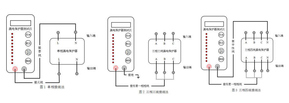 漏电保护器测试仪使用时接线示意图说明及介绍: